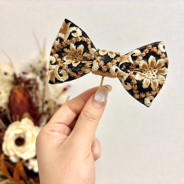 インド刺繍リボンを使ったリボン型のヘアアクセサリーです。 裏側にポニーフックが付いているので、ヘアゴムで髪をまとめた結び目部分に引っ掛けてご使用ください。 手軽にご使用いただけるため、時間のない朝などにおすすめの商品です☺︎ サイズ:縦5.5cm×横10cm