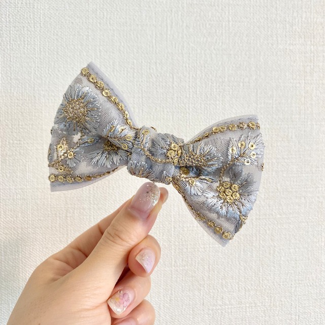 インド刺繍リボンを使ったリボン型のヘアアクセサリーです。 裏側にポニーフックが付いているので、ヘアゴムで髪をまとめた結び目部分に引っ掛けてご使用ください。 手軽にご使用いただけるため、時間のない朝などにおすすめの商品です☺︎ サイズ:縦4cm×横9.5cm