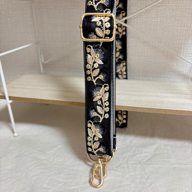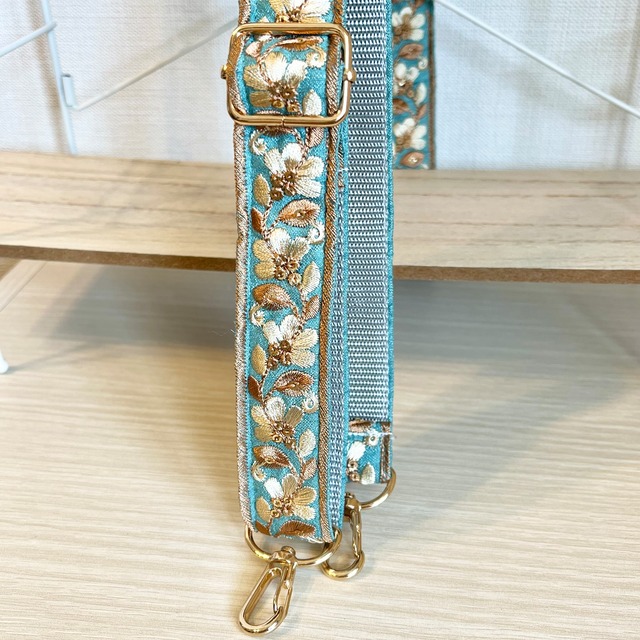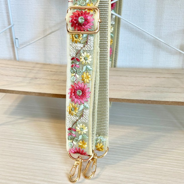 インド刺繍リボンを使った スマホやカバンに付けられるショルダーストラップです❁⃘*.゚ こちらの商品は紐の長さが調節できるタイプとなっております☺︎ 太さ:約3.5cm 長さ:約80cm〜145cm(金具部分含む)