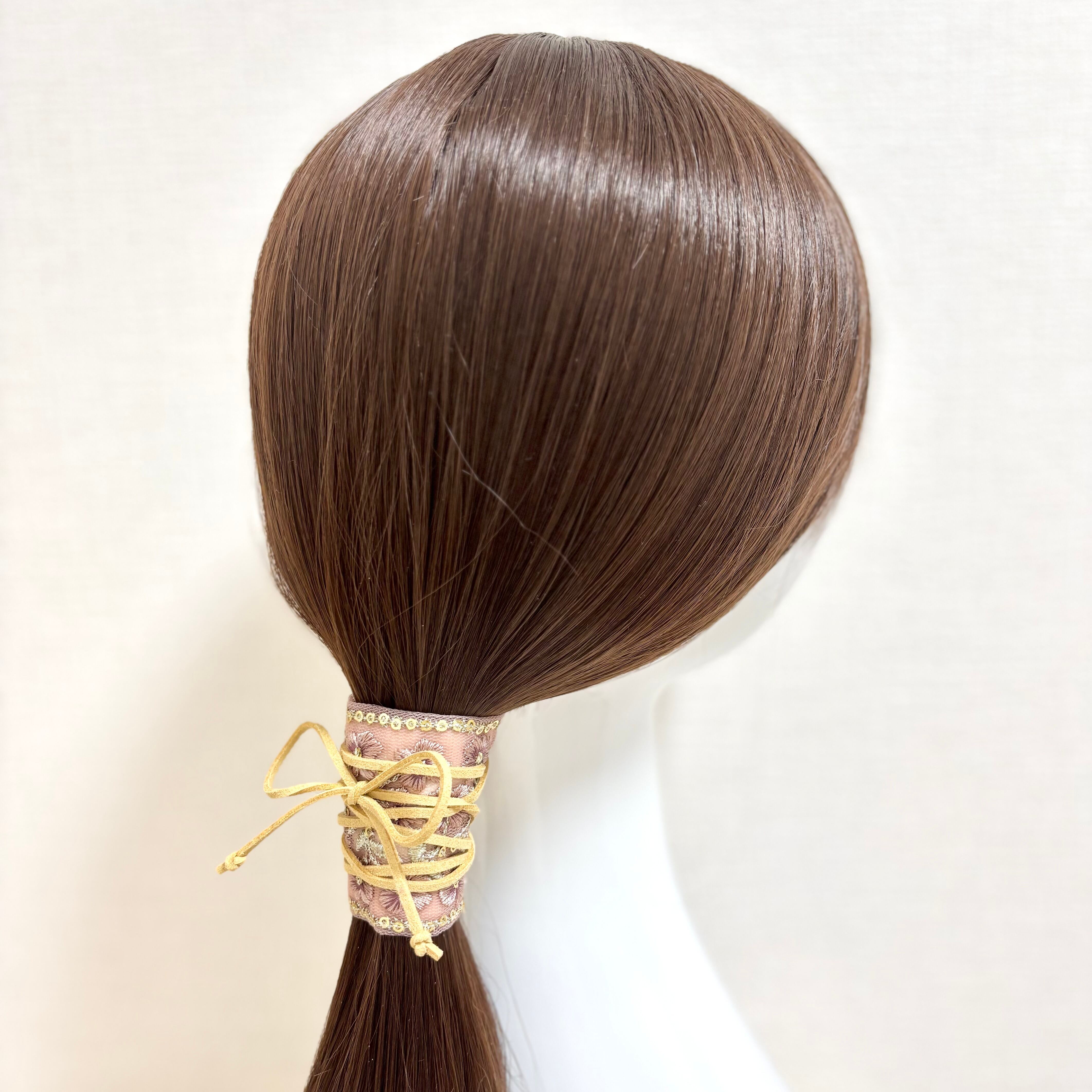 裏側にフックが付いているので、ヘアゴムで髪をまとめた結び目部分に引っ掛けた後、スエード紐をお好みの形に巻き付けてご使用ください。