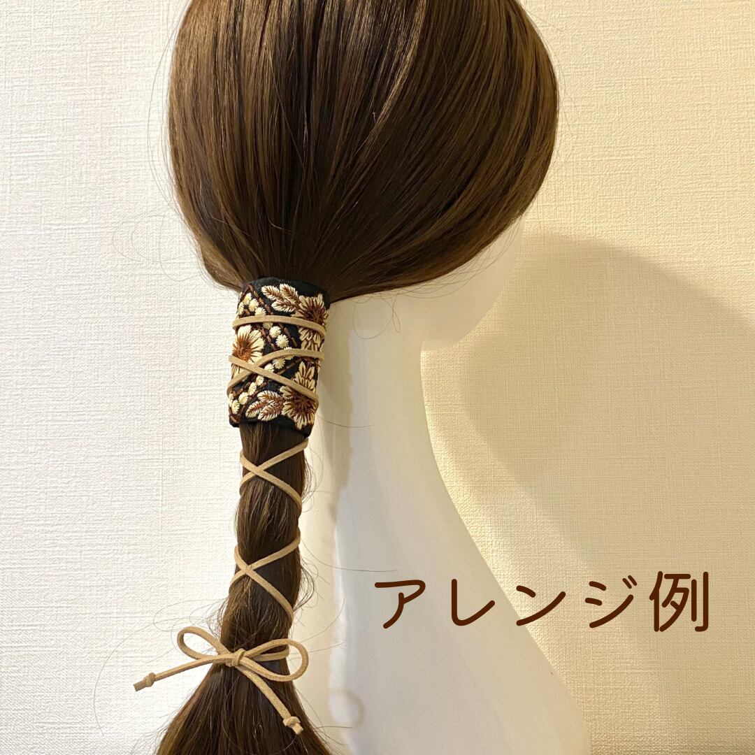 裏側にフックが付いているので、ヘアゴムで髪をまとめた結び目部分に引っ掛けた後、スエード紐をお好みの形に巻き付けてご使用ください。