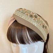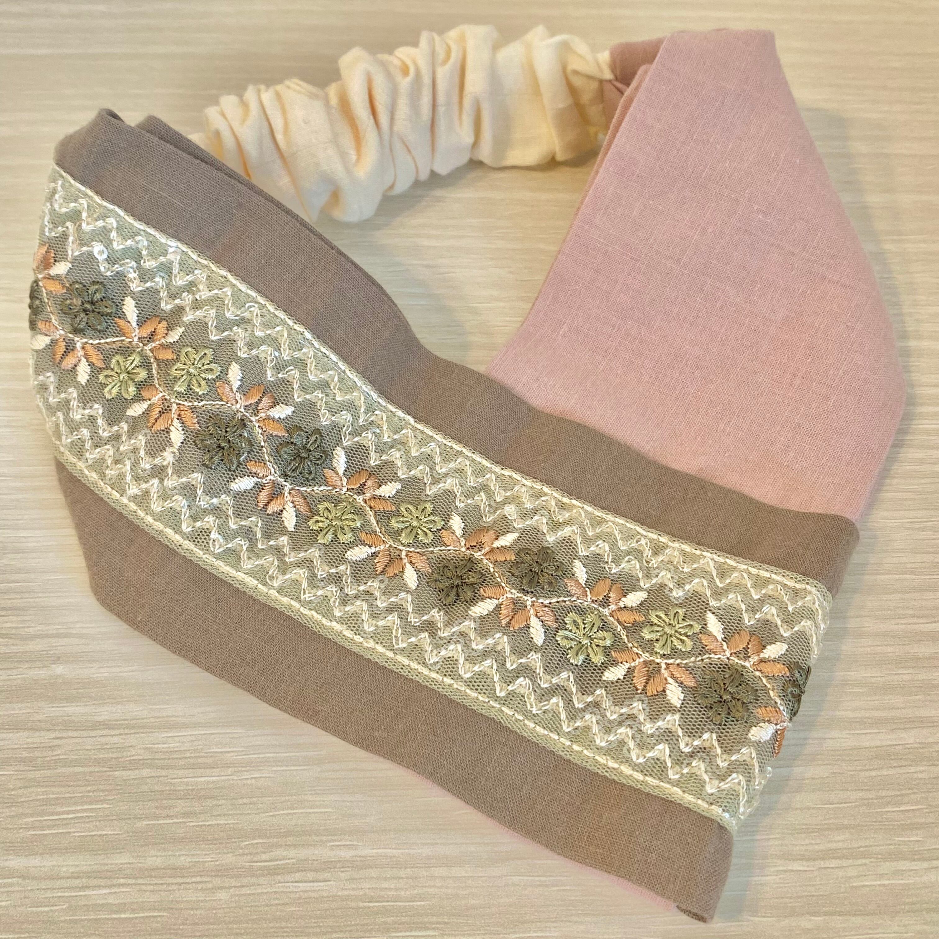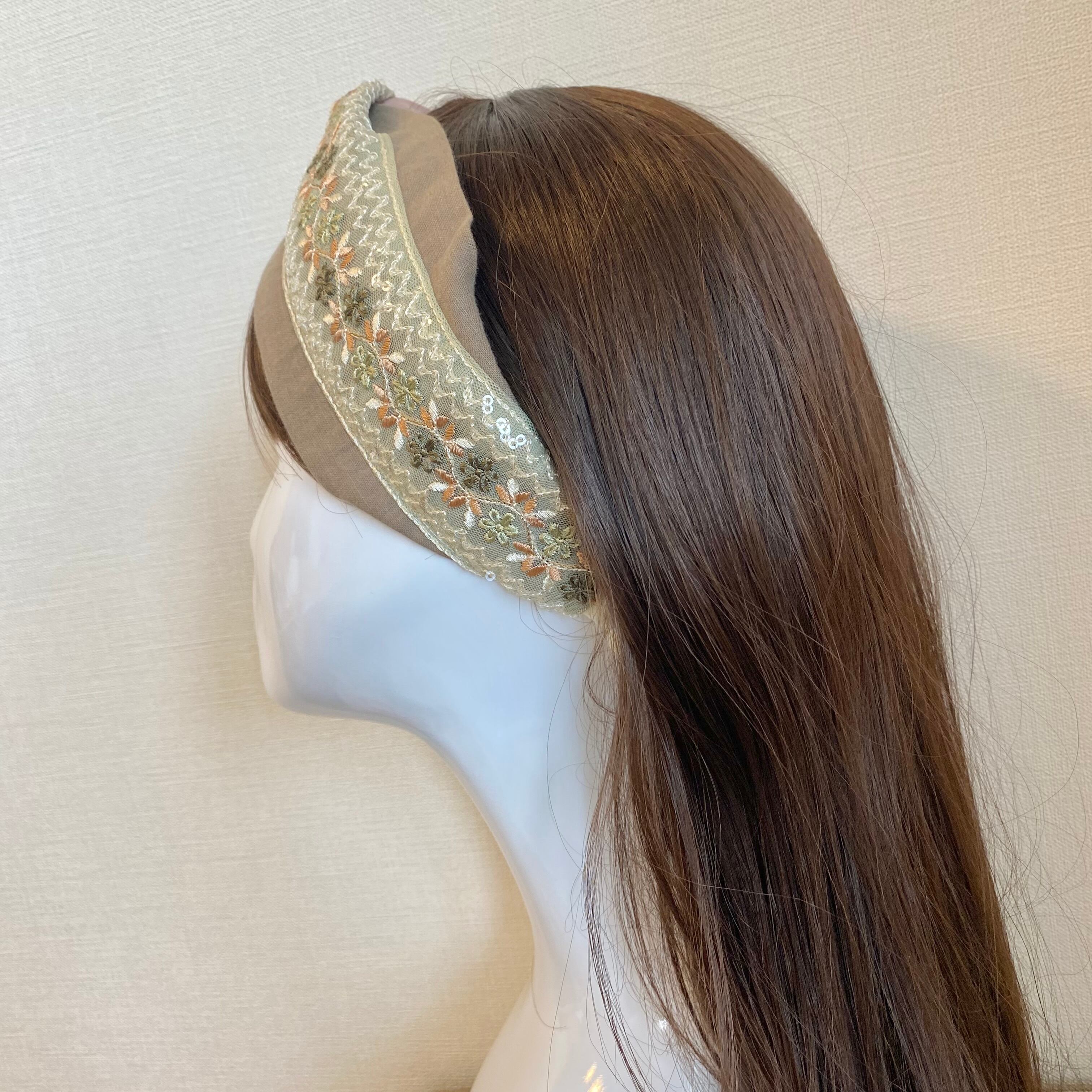 インド刺繍リボンを使ったヘアターバンです。 生地が少し薄めで、着け感軽めタイプです。 サイズ:フリーサイズ(頭囲約55cm)