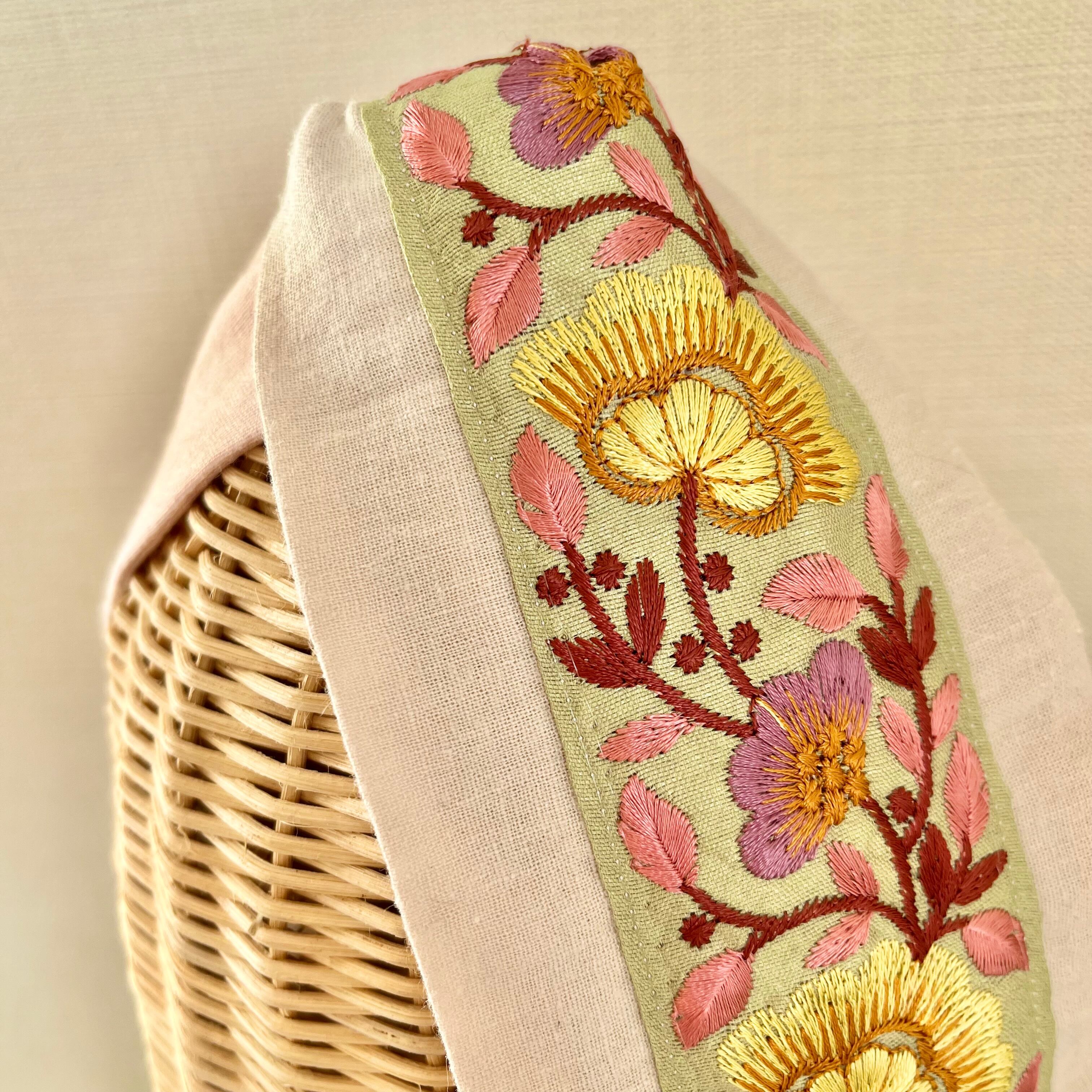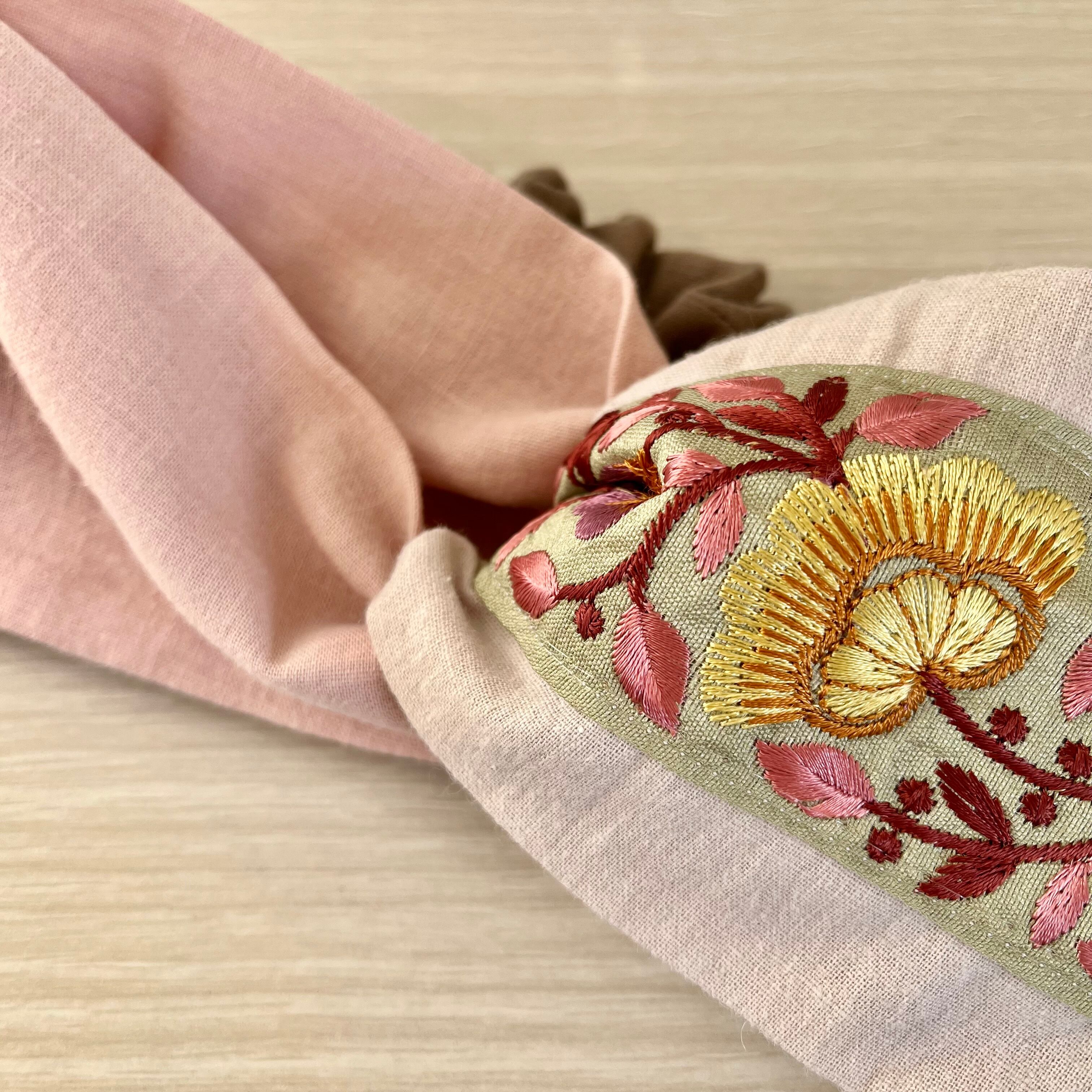 インド刺繍リボンを使ったヘアターバンです。 生地が少し薄めで、着け感軽めタイプです。 サイズ:フリーサイズ(頭囲約55cm)